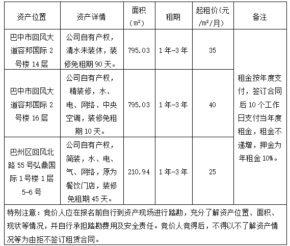 根據(jù)國有資產(chǎn)管理相關規(guī)定,巴中自然資源投資集團有限公司決定對相關資產(chǎn)進行公開招租?,F(xiàn)將有關事項公告如下: