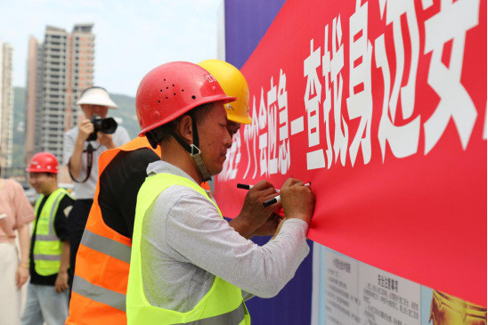 啟動儀式上,公司黨總支副書記、總經(jīng)理馮皓代表業(yè)主單位致辭,宣布安全生產(chǎn)月活動正式啟動。馮皓強調(diào)安全生產(chǎn)對項目建設的重要性,要求全體人員將安全理念貫穿工作始終,積極參與各項安全活動。并特別指出,張家河生態(tài)修復項目承載著改善區(qū)域生態(tài)環(huán)境、造福一方百姓的重要使命。作為項目業(yè)主,深知安全生產(chǎn)不僅是項目順利推進的基石、守護建設者生命安全的防線,更是踐行社會責任、保障生態(tài)修復事業(yè)高質(zhì)量發(fā)展的核心要義。隨后,施工單位代表領誓,宣讀了《安全生產(chǎn)誓詞》。緊接著,參與人員在“安全生產(chǎn)月”主題橫幅上簽名,以莊重的形式明確自身安全責任。